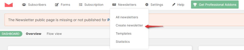 - Gdy zakończyliśmy ustawianie naszego systemu wysyłki, pora przejść do clou programu, jakim jest utworzenie pierwszej wiadomości biuletynu. Przejdźmy zatem do menu ustawień wtyczki oraz zakładki Newsletters.
